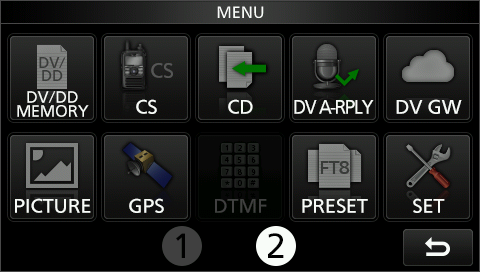 10個の機能アイコンと、下部に、丸の①、②の部分が表示されます。