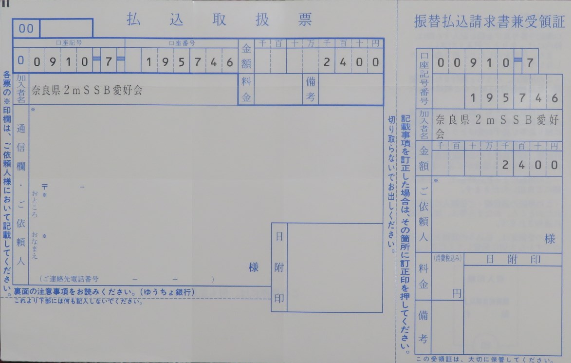 なお、振替用紙には、必ずご芳名・コールサイン・ご住所・連絡先メール・電話番号など、ご記入をお願いいたします。