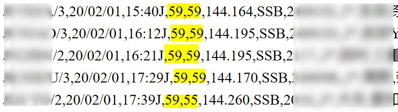- 直接申請支援サーバーにアップー度するテキストファイルが、ハムログが生成するcsvファイルでなく、Excelなどで整形した場合、エラーを発生します。ハムログの抽出機能では、年月日が、令和2年2月1日を、20/02/01 と生成します。これを、20/2/1 とすると、ハムログが生成した様式ではないので、エラーとなります。