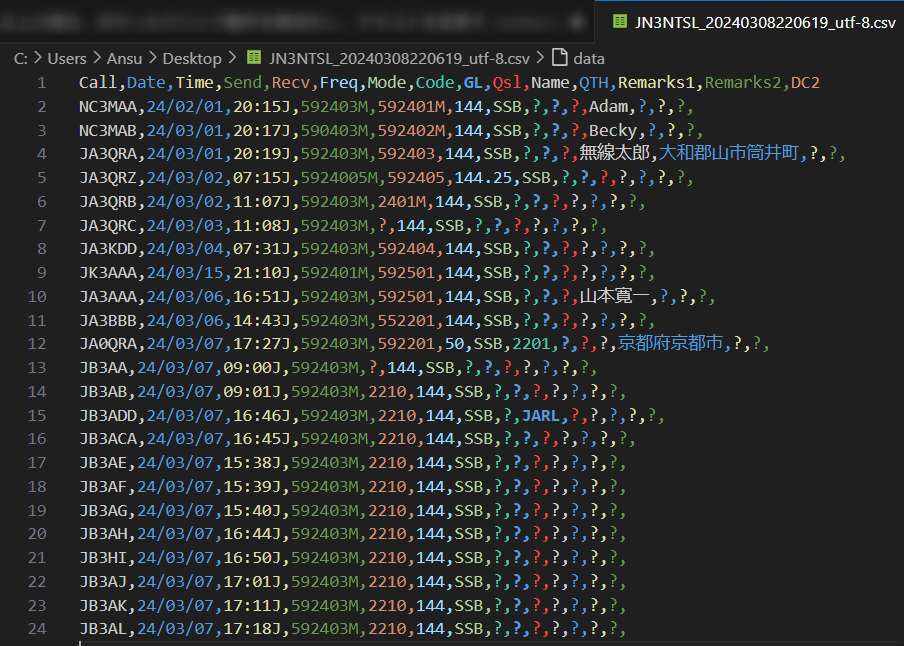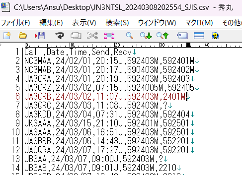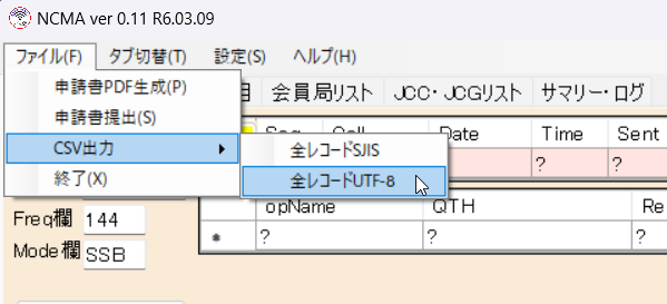 Uncategorized 3月 8 2024 交信ログ内容のCSV出力 / NCMA戻る・Back NCMAに記録した交信ログは、NCMAがコンテスト処理をして、規定のサマリーやログを作製し、電子申請まで利用いただける機能を目指しています。 しかし、場合によって利用者が、NCMAに保存整理した記録内容を取り出して、再利用することも考慮してデザインしています。 様々な関連アプリでは、CSV形式のテキストファイルに整えられたデータが利用できる場合があるので、これに対応できる機能デザインを検討しています。 出力例(SJIS) 出力例(UTF-8) Ed 0 コメント