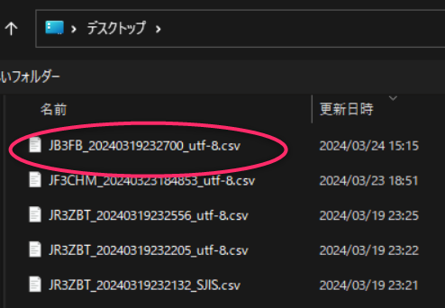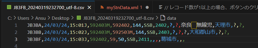 例えば、ハムログから、CSVテキストデータとして、取り出したSJISエンコードファイルを、以下のように、UTF-8 に変換されたファイルが用意できているとします。