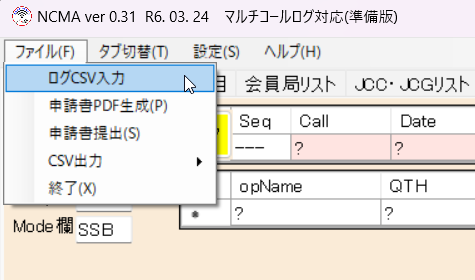 メニューから、「ファイル(F)」を選び、下位のコマンドから、「ログCSV入力」を指定します。