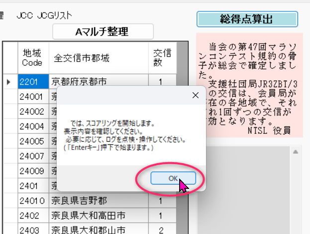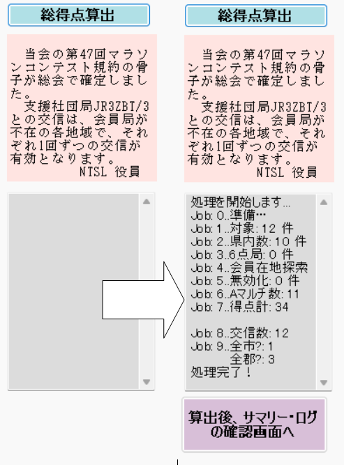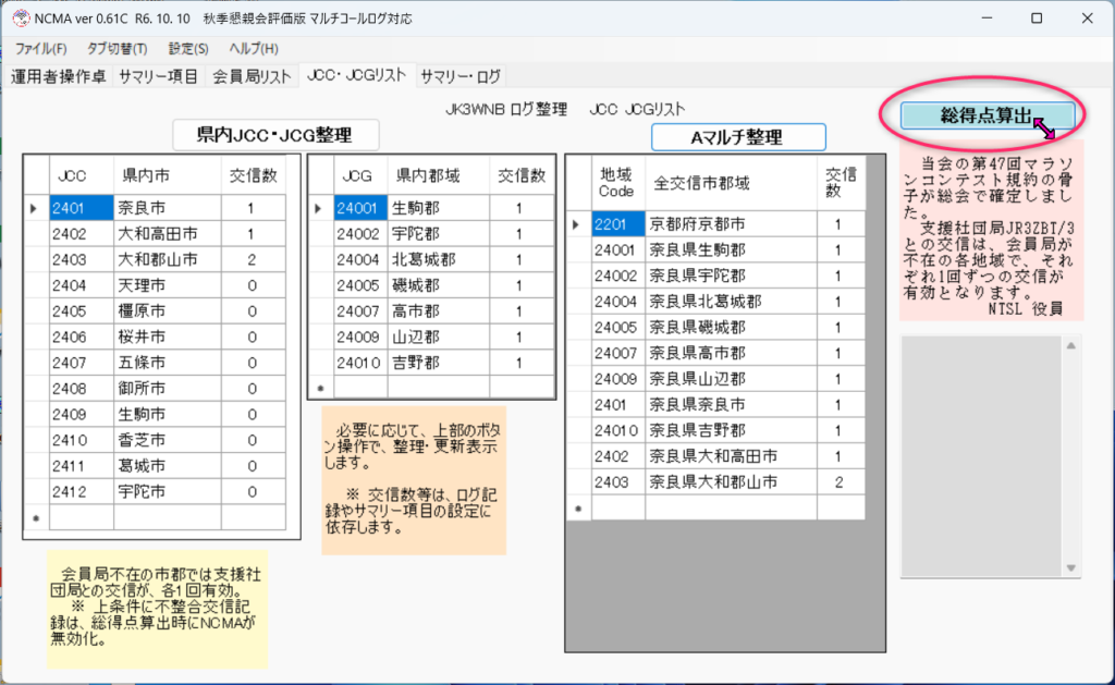 NCMA 10月 12 2024 総得点算出/NCMAタグページ「JCC・JCGリスト」画面から、右上のボタンを操作して、総得点の算出処理ができます。 「総得点算出」のクリックで、以下のメッセージが表示されるので、確認の[OK]をクリックします。 すぐに、NCMA は、いくつかの手順で、データを確認しつつ、処理を進めます。 その都度、以下のように、画面右に処理状況が示され、左から右の画面へと変化します。 Ed 0 コメント