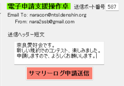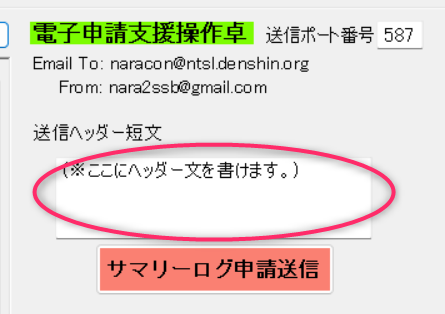 NCMA 10月 12 2024 電子メール申請時のヘッダー文/NCMA生成されたサマリー・ログは、ヘッダー文を文頭につけて、申請先へ電子メールを送信することで、申請手続きが済みます。 そのとき、以下の枠内に適する文を付けることができます。 例えば、以下のような文を、左のサマリー・ログの先頭に付して、送信できます。 送信は、「サマリーログ申請送信」ボタンのクリック操作で実行できます。 Ed 0 コメント