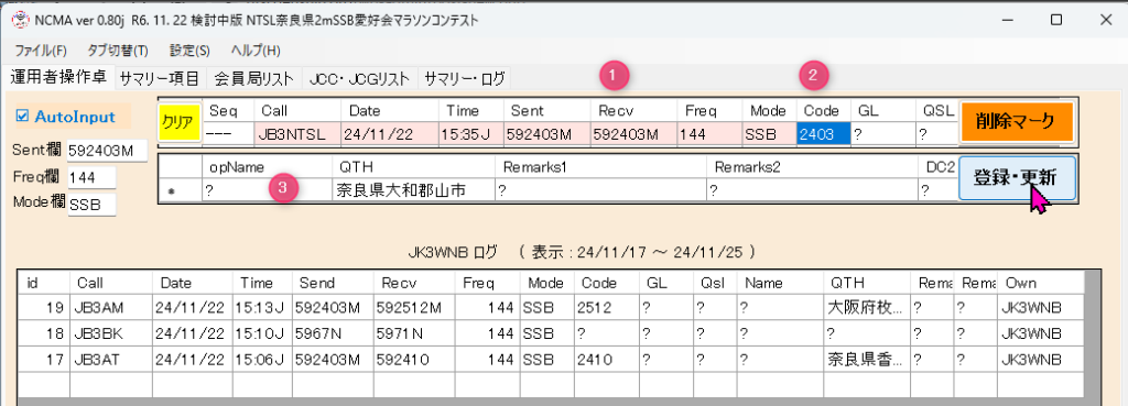 NCMA 11月 22 2024 Recv欄入力と機動的動作/NCMANCMA Version 0.80j で機能改訂しました。 AutoInputボタンがチェックされているとき、 相手局からコンテスト送信されたナンバーを Recv 欄①に確定すると、RSポートを除くエリアコードを取り出して、Code欄へ自動入力②します。 同時に、取り出したCode欄の値に該当する市郡名を、QTH欄に自動入力③します。 ※この機能は、NTSLコンテスト用です。 Ed 0 コメント