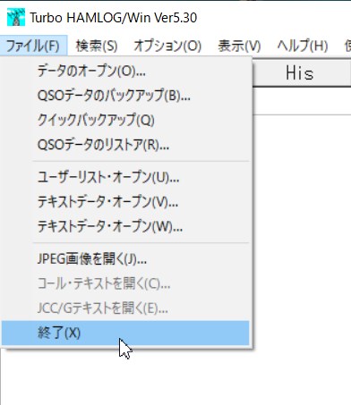 アプリケーションを終了するには、上部左の「ファイル(F)」をクリックして、以下のようなメニューの最下部にある、「終了(X)」をクリックします。