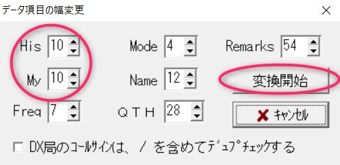 赤枠で強調しているように、[His], [My]のデータ項目の幅の数値を、共に、10 へと変更して、右側にある、「変換開始」のボタンをクリックします。