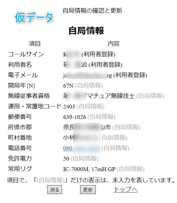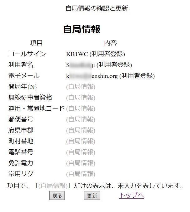最初は、利用者登録情報(コールサイン、氏名、電子メールアドレス)だけが、すでにシステムにあります。それ以外は、グレーの (自局情報) としか表示されません。これは、説明にもあるように、未登録であることを意味しています。