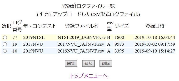 選択、ログ番号、年・コンテスト、登録ファイル名、CSV型、サイズ、登録日時 が表示されます。