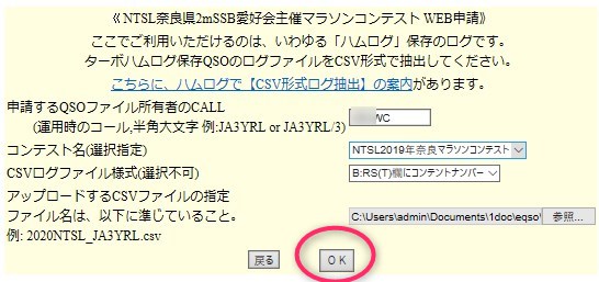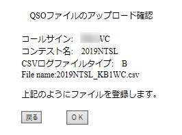 NVUの場合と同様、[ 表示 ] のボタンを使って、ログファイルをローカルのディレクトリィから、NTSLコンテストのCSVログファイルを選び、下の画面を確認後、[ OK ] ボタンをクリックします。