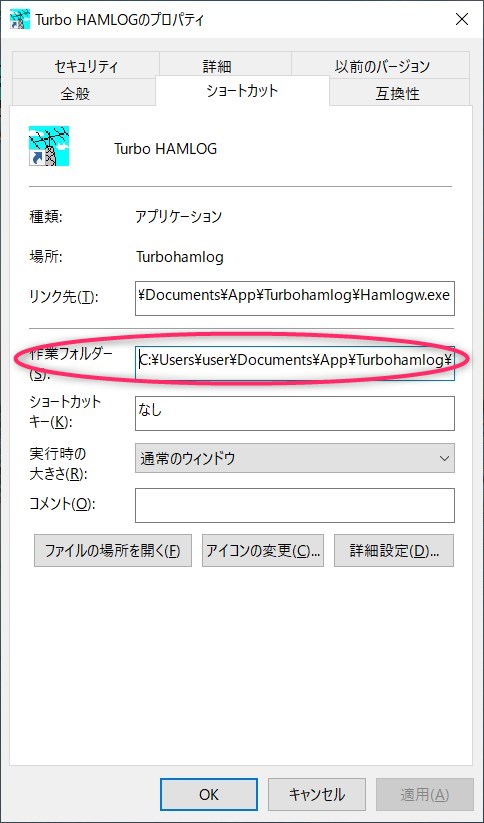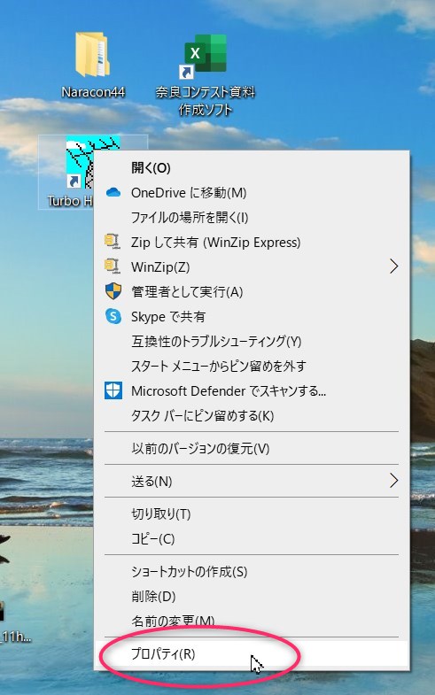 使用しているハムログの、ショートカットアイコンを、右クリックしますと、以下の画面となります。