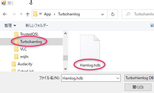 読み込むTurboHAMLOG の Hamlog.hdb のファイルを指定して、「開く(O)」を操作します。